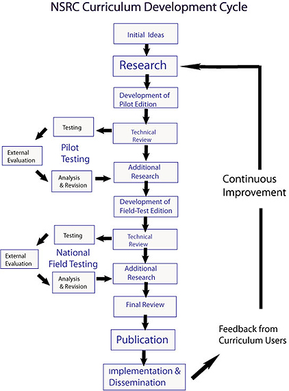 NSRC curricula is created through a rigorous research and development process. Scientists and educators act as consultants to teacher-developers, who research, develop, trial teach, and field test before producing the final product.